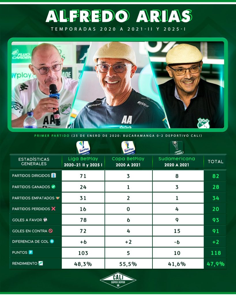 Arias deja la dirección técnica del Deportivo Cali, a pesar de tener aun seis meses más de contrato con la institución verdiblanca, poniendo fin a su segundo ciclo al frente del equipo.