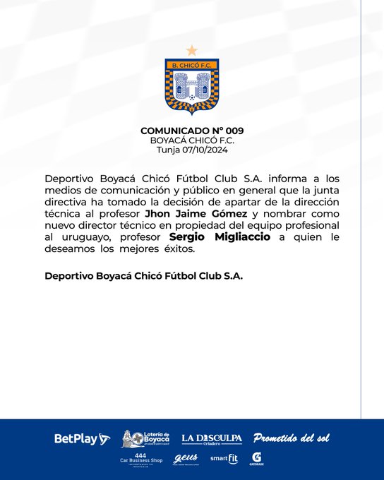 El turno ahora fue para John Jaime Gómez, quien fue separado de su cargo en el Boyacá Chico, a pesar de avanzar a los cuartos de final de la Copa Colombia BetPlay, pero con el fantasma del descenso.