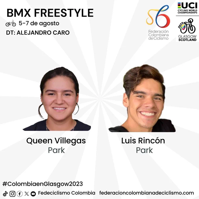Por primera vez Colombia tendrá presencia en un Campeonato Mundial en la modalidad de BMX Freestyle, con Queen Saray Villegas y Luis Rincón, que estarán participando en la modalidad park, entre el 5 y el 7 de agosto