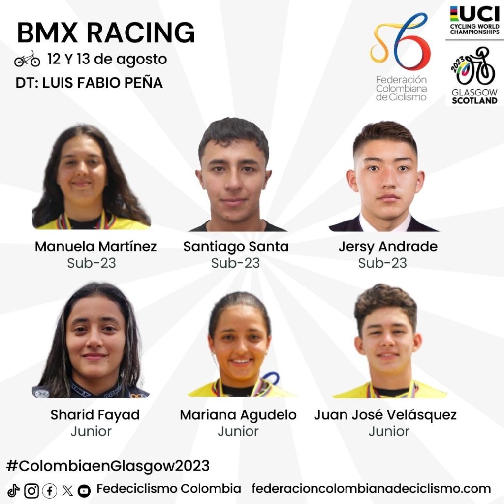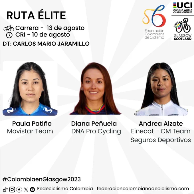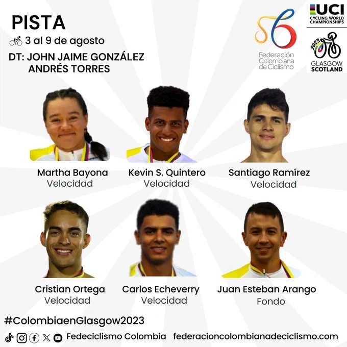 La Federación Colombiana de Ciclismo, confirmo la lista de pedalistas que representarán al país en los Mundiales de Ciclismo, que se desarrollaran desde el próximo 3 de agosto y hasta el 13 en Glasgow.