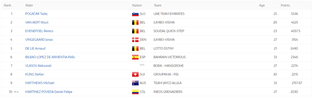 Martínez, es décimo en el escalafón mundial que es comandado por el esloveno Tadej Pogacar, reciente ganador de la Vuelta a Andalucía, por delante del belga Wout Van Aert y de Remco Evenepoel, quienes completan el podio.