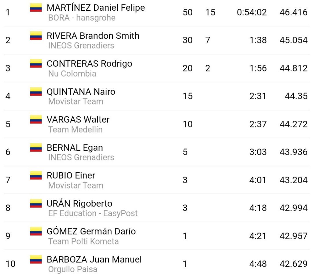Martínez cubrió los 41.8 kilómetros entre Paipa y Tunja, en 54 minutos y 2 segundos, para un promedio de 46.4 kilómetros por hora y aventajó por un minuto y 38 segundos aBrandos Rivera del Ineos-Granadiers.