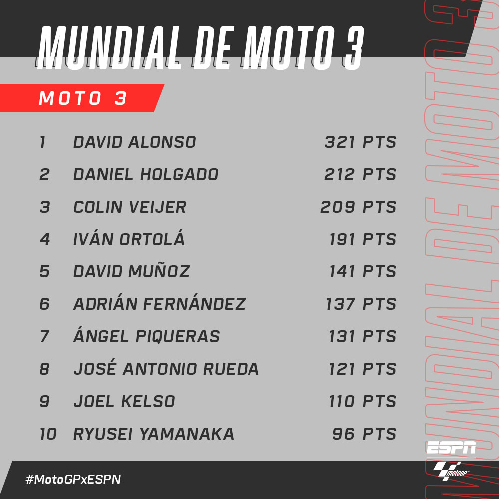 Es el primer colombiano en coronarse campeón de la categoría, en la que alcanzó diez victorias de carrera, y acumula 321 puntos, seguido por el español Daniel Holgado que tiene 212 a falta de cuatro grandes premios.