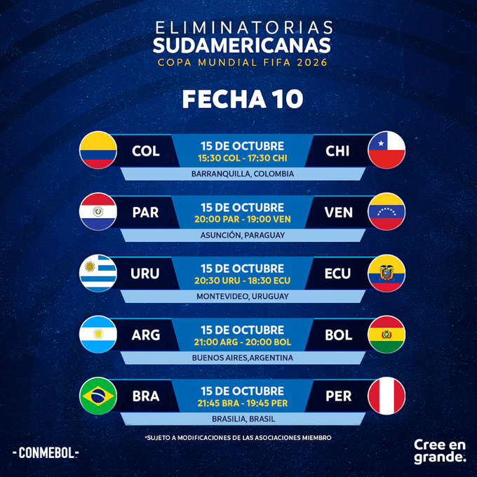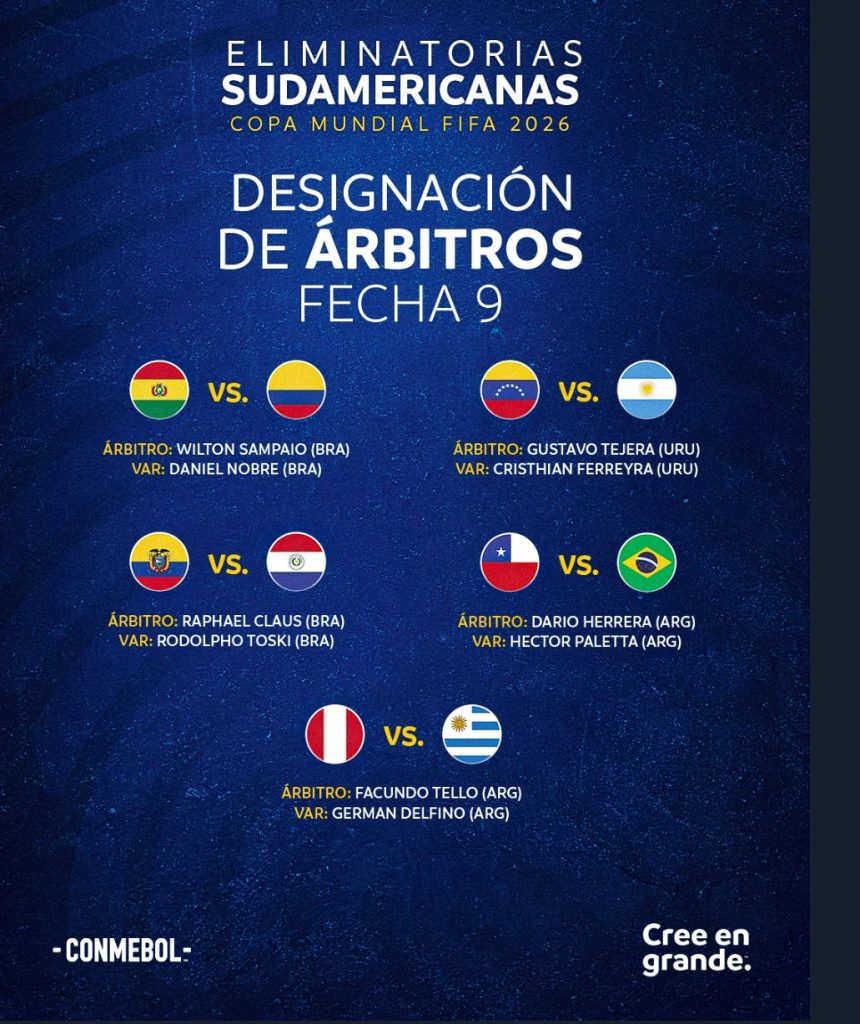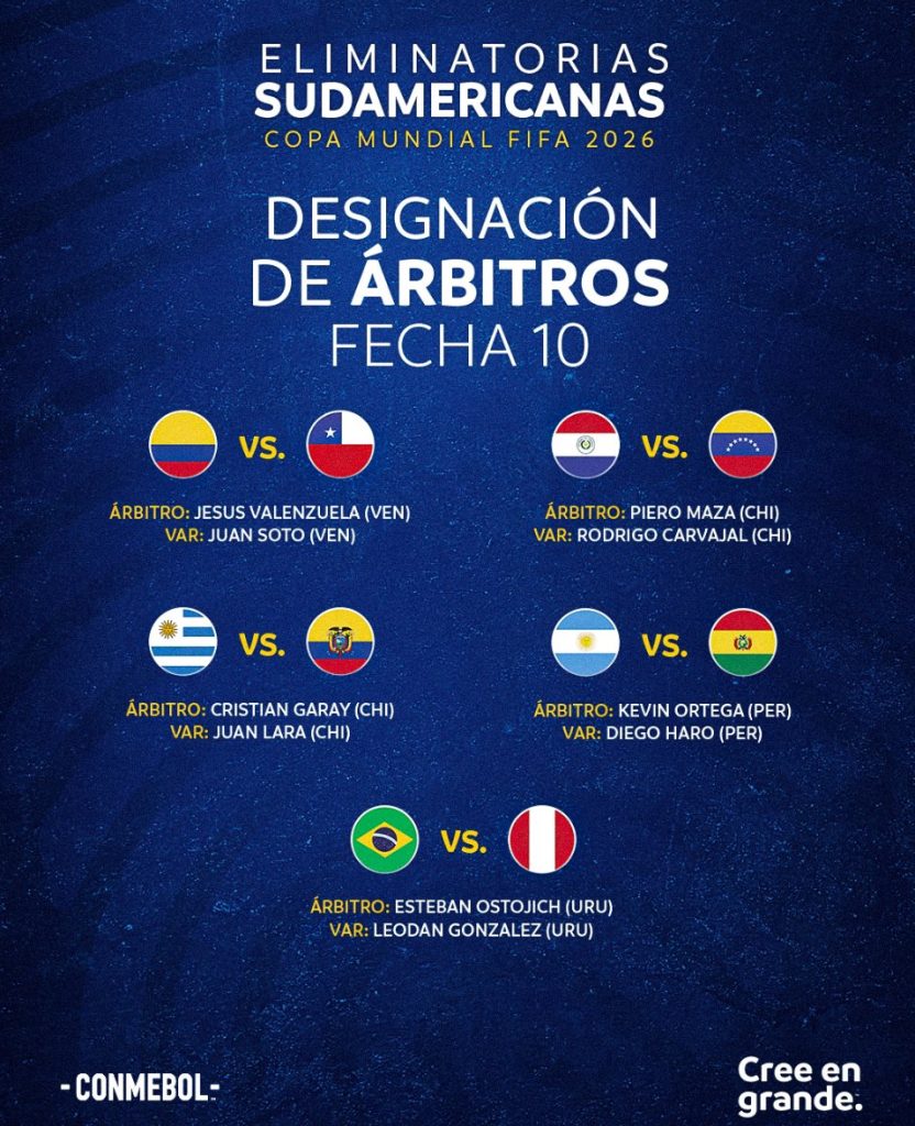Quedaron definidas por parte de la Conmebol, los días, la hora y los árbitros de las dos próximas jornadas de la eliminatoria sudamericana, programadas para el mes de octubre.