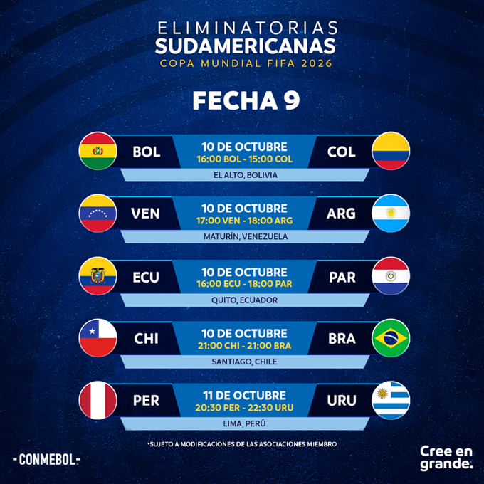 La novena fecha de la eliminatoria se jugará entre el jueves 10 y viernes 11 , mientras que la decima fecha se disputará en su totalidad el martes 15 de octubre.