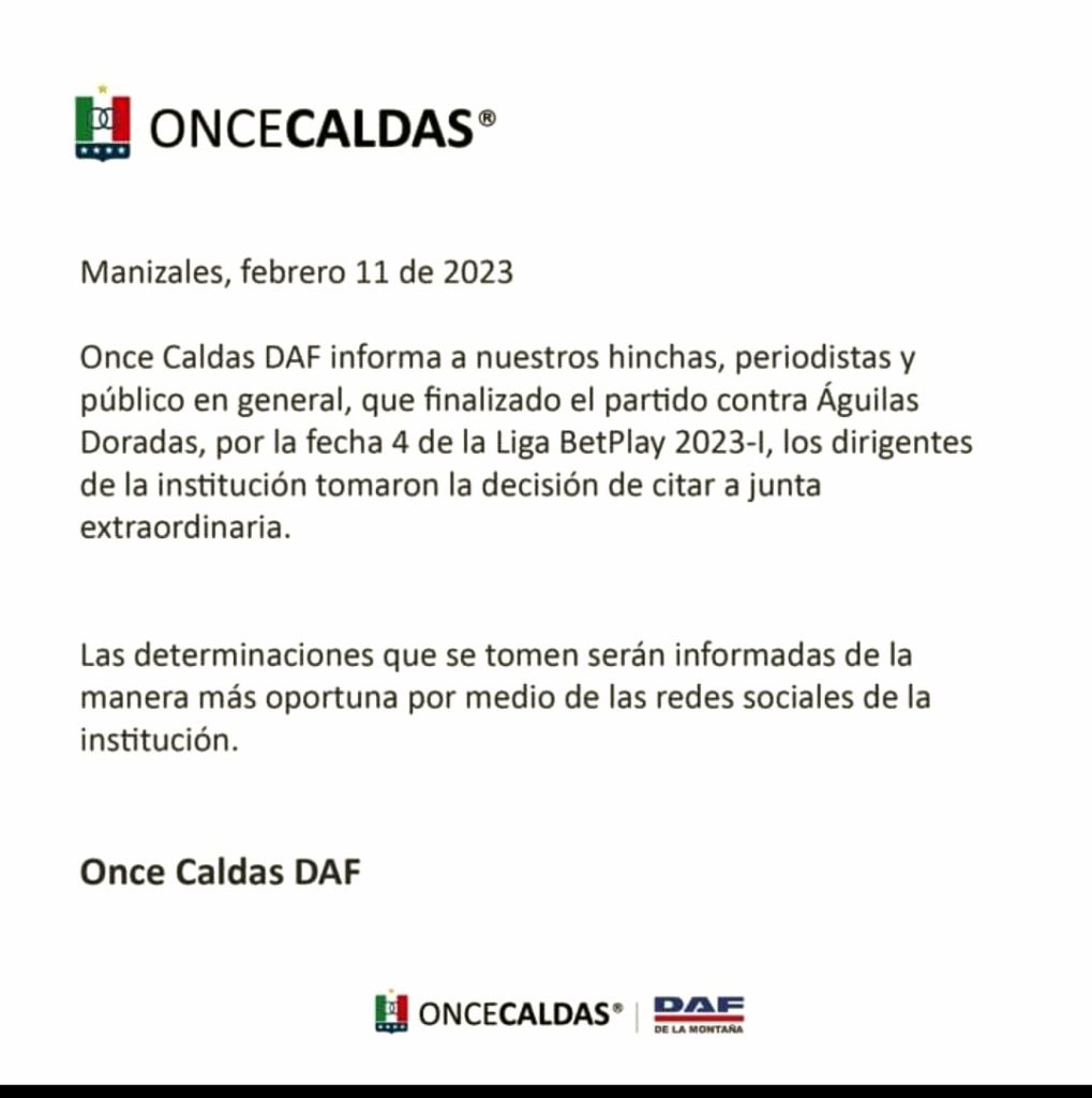 La junta directiva del Once Caldas, estudiará la continuidad o no del técnico Diego Corredor al frente de la institución caldense, después de la derrota ante Águilas Doradas, así lo confirmo en un comunicado.
