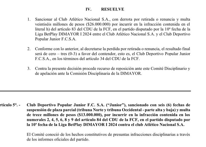 Junior demás de quedarse con los tres puntos, es castigado con la suspensión de 6 partidos a la tribuna norte y tribuna occidental alta y baja. Además pagará 13 millones de pesos de multa.