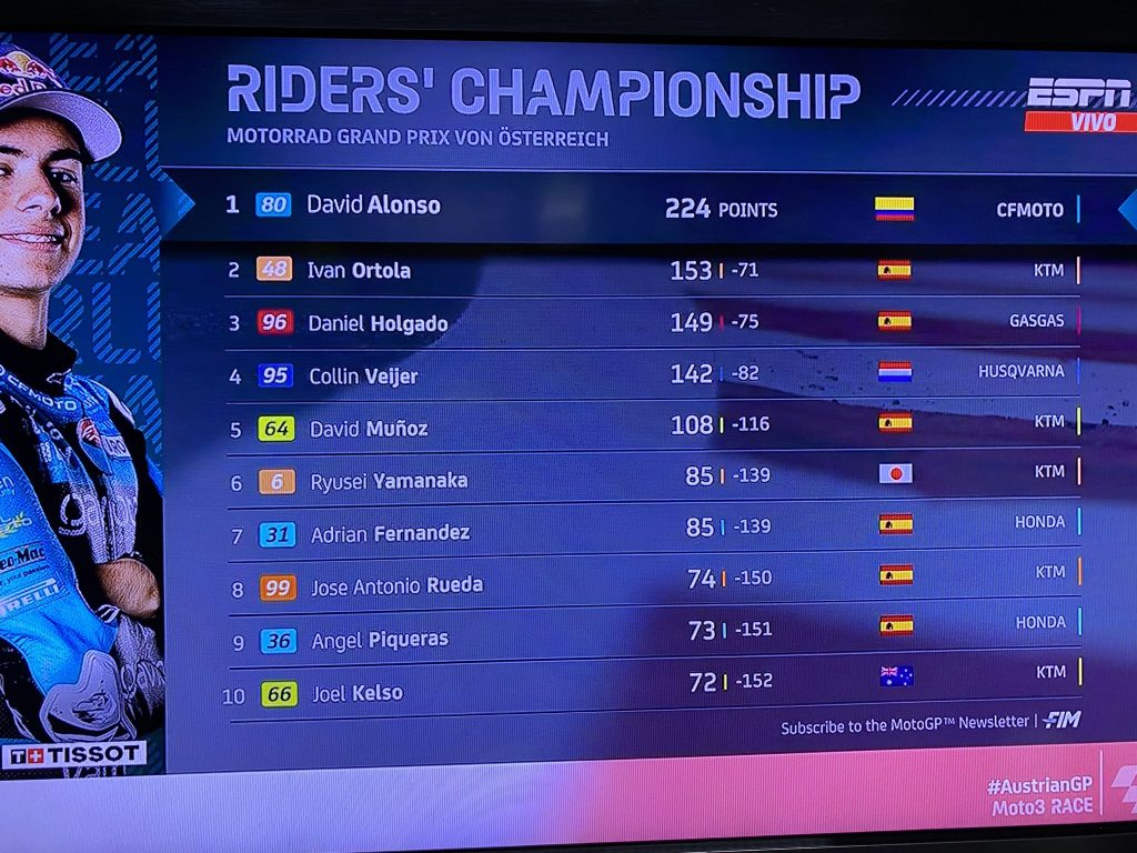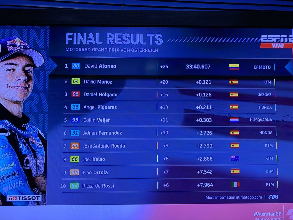 El colombiano aumentó su ventaja en el mundial de la Moto3 después de su triunfo en Austria de 63 a 71 puntos, celebrando con un baile que se hizo viral en las redes.