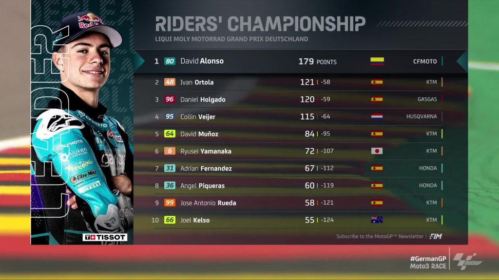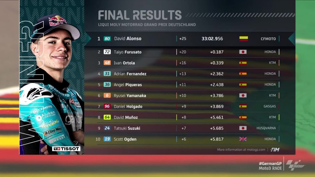 El colombiano David Alonso, sigue dominando el Mundial de Moto3 europea, al ganar el Gran Premio de Alemania y conseguir su sexta victrola en la temporada y la décima en la categoría.