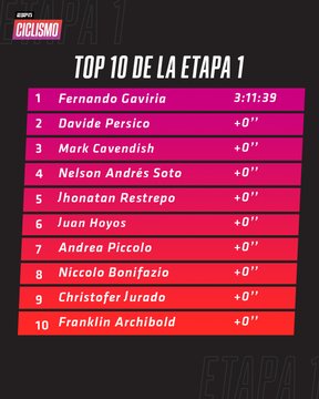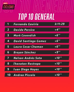 Gaviria de 29 años, se impuso al sprint, superando al italiano Davide Persico (Bingoal WB) y Mark Cavendish (Astana-Qazaqstan), quienes fueron segundo y tercero respetivamente