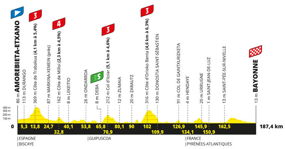 Este lunes se disputará al tercera fracción del Tour, una etapa de 187.4 kilómetros, con cuatro pequeñas dificultades en los primeros 90 kilómetros de la jornada entre Amorebieta-Etxano y Batona.