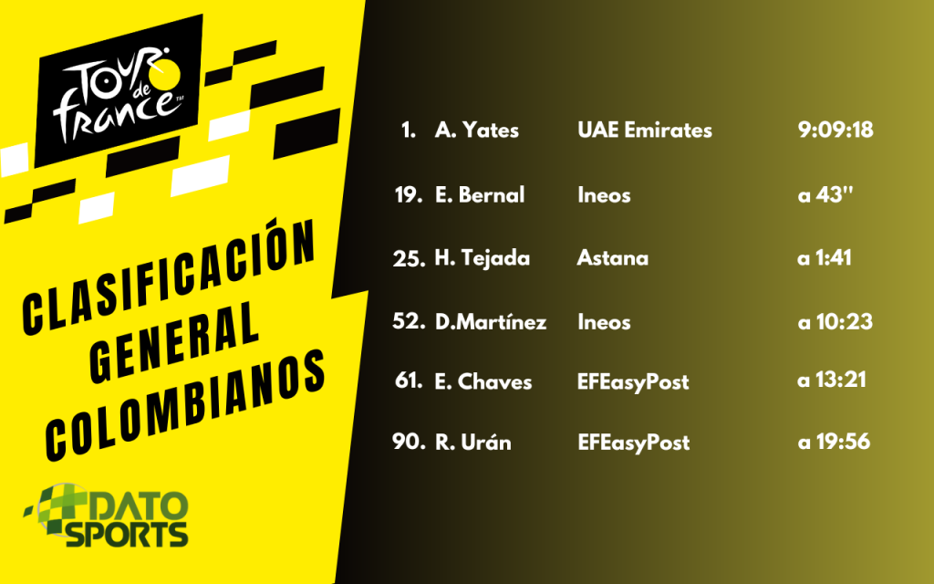 Por su parte, Adama Yates (UAE Emirates) se mantuvo como líder después del segundo día de competencia y Egan Bernal (Ineos-Granadiers) se metió en el Top-20 de la general, siendo el mejor de los colombianos.