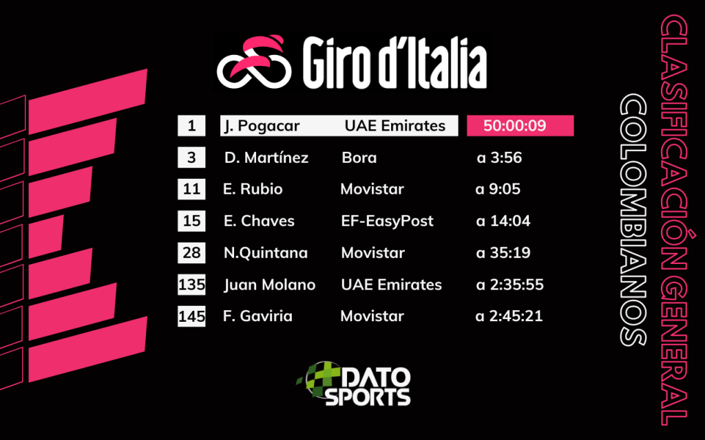 Tadej Pogacar (UAE Emirates) fue segundo en la fracción y aumentó sus deferencia a todos sus rivales al título final, el colombiano Daniel Felipe Martínez (Bora-Hansgrohe) finalizó en el puesto 14 de la etapa y ahora es tercero en la general.
