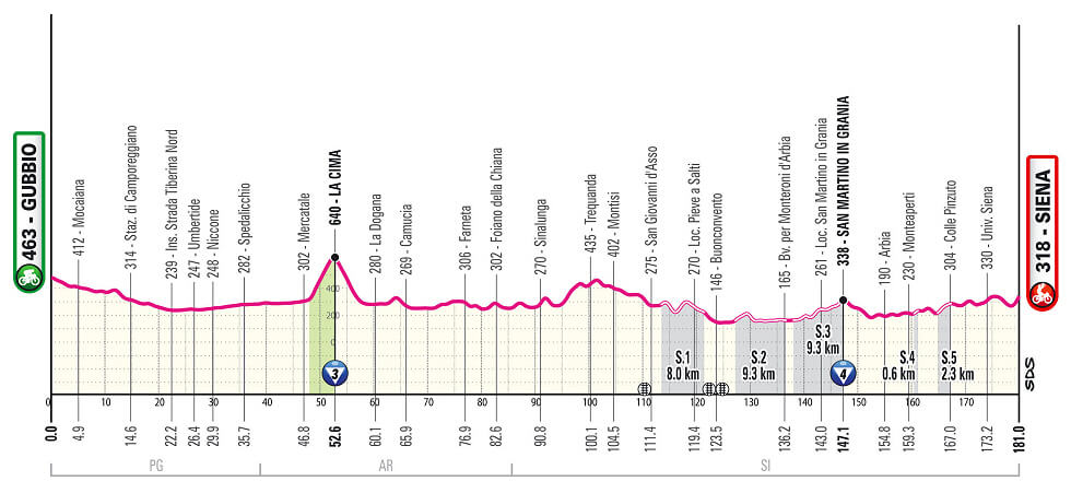 Este domingo, el pelotón de l Giro de Italia, afrontará la novena etapa de 181 KM entre Gubbio y Siena, un trazado que incluye varios sectores rizados de pavés o de sterrato, además de la exigente subida a san Martino in Grania propicia par una gran batalla por la maglia rosa.