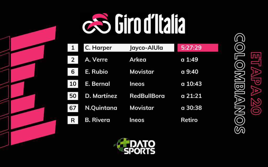 La etapa se la llevo con una galopada espectacular, el australiano Chris Haroper (Jayco-AlUla) de manera solitaria arribando ala meta con un minuto y 49 segundos sobre el italiano del Arkea Alessandro Verre.