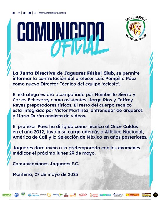 La junta directiva de Jaguares de Córdoba, confirmó la llegada de Pompilio Páez como nuevo técnico del equipo felino par el segundo semestre de la temporada 2023.