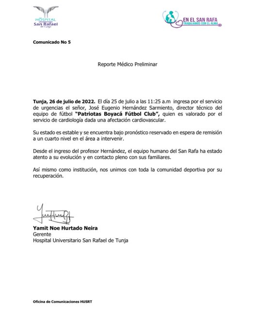 Hernández que trabaja con el equipo boyacense desde el pasado mes de junio, sufrió un trombo y los médicos estudian la posibilidad de una operación y el traslado a Bogotá.