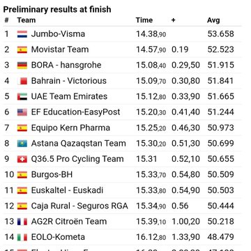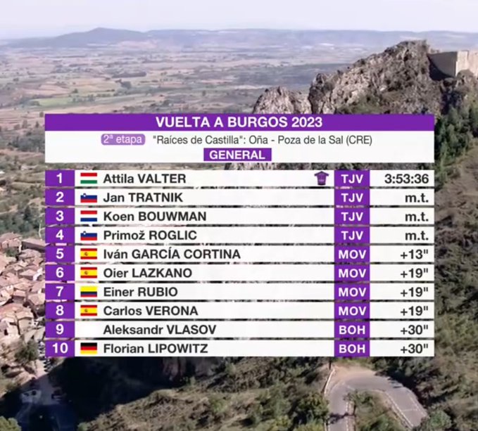 El Team Jumbo Visma se impuso en la contrarreloj por equipos de la Vuelta a Burgos, con un tiempo de 14 minutos y 38 segundos. Asumiendo el liderato de la competencia con el húngaro Attila Valter.