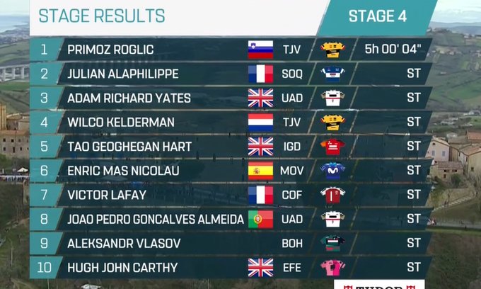 Roglic empleo un tiempo de 5 horas y 3 segundos, superando en el embalaje final a francés Julian Alaphilippe y Adam Yates, segundo y tercero respectivamente.