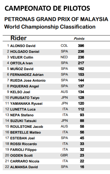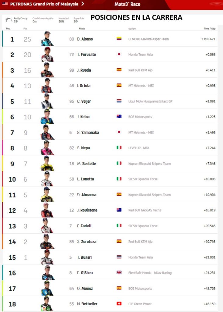 Después de una espectacular remontada, el piloto colombo-español David Alonso, se quedó con la victoria en el Gran Premio de Malasia, valida correspondiente al campeonato Europeo de Moto3..