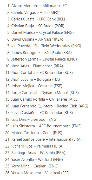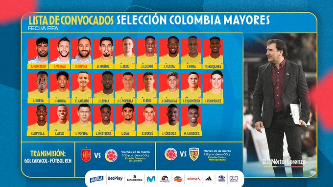 El técnico de la Selección Colombia Néstor Lorenzo, entregó la lista de 26 jugadores convocados para el doble compromiso en la fecha FIFA del mes de marzo.