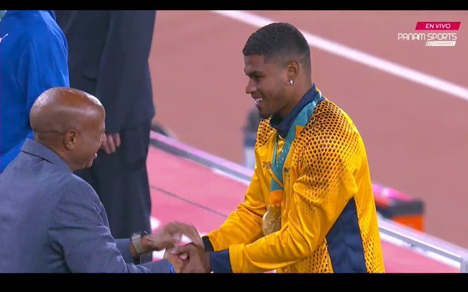 El señor que le da la medalla a Arnovis es Mike Powell, dueño del récord mundial del salto largo con 8.95 metros. Arnovis tiene el colombiano con 8.18