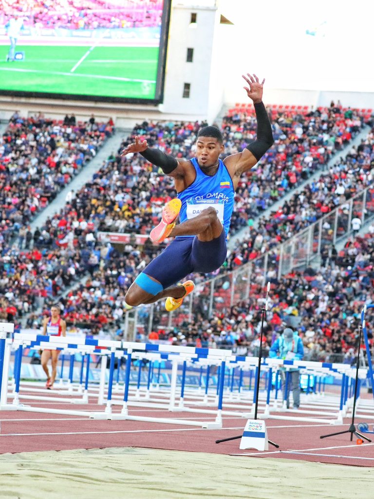 El atleta colombiano Arnovis Dalmero, se baño en oro al ganar la presea dorada en el salto largo de los Juegos Panamericanos de Santiago 2023.