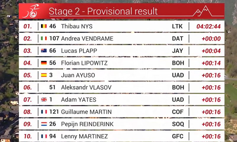 El ciclista belga Thibau Nys (Lidl-Trek) se adjudicó la segunda etapa del Tour de Romandía, al coronar la fuga del día y rematar al sprint en el puerto de montaña donde estaba ubicada la línea de meta después de recorrer los 171 kilómetros.
