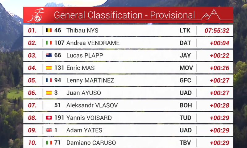 La carrera continuará este viernes con una etapa contrarreloj individual de 15.5 kilómetros, con salida y llegada en Oron, que puede marcar diferencias entre los favoritos.