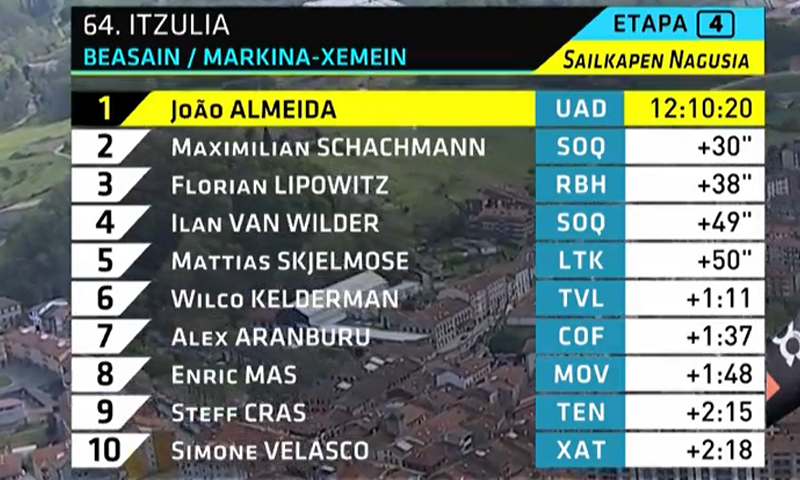 El portugués desbanco por 30 segundos al alemán Maximilian Schachmann por 30 segundos, quien fue tercero en la etapa.
