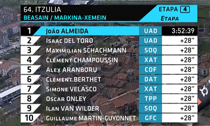 El ciclista portugués Joao Almeida (UAE Emirates-XRG) se impuso en la cuarta etapa de la Itzulia al País Vasco, al cruzar en solitario la meta en Bizkaia, después de 169.6 kilómetros y apoderarse del liderato de la competencia.