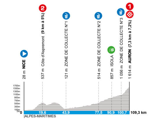 La séptima etapa fue recortada en 38 kilómetros debido a las malas condiciones meteorológicas y ahoar los pedalistas deberán afrontar 109.3 kilómetros entre Niza y Auron, con dos importantes ascensos, uno de segunda y uno d eprimera categoría, este último en la meta.