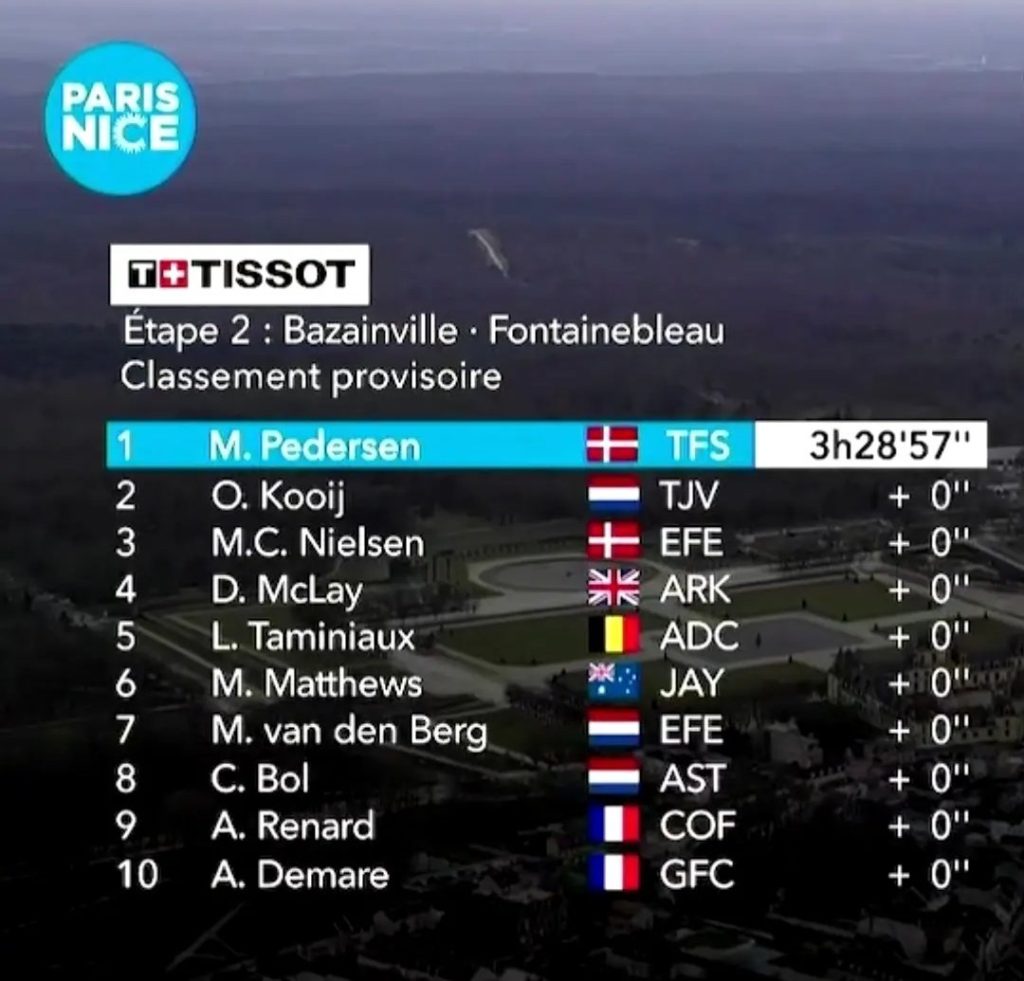 ¡Victoria de Pedersen! El danés del Trek Segafredo se ha llevado la segunda etapa de la #ParisNice tras imponerse en un sprint muy ajustado y es el nuevo líder. "Pogacar segundo en la general a tan solo dos segundos del líder".😍💪👍 pic.twitter.com/QC2JkqCbzP