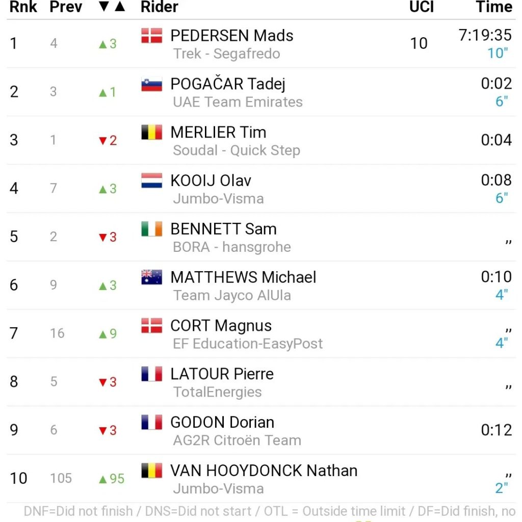 El colombiano Daniel Felipe Martínez, ingreso con el mismo tiempo del ganador de la etapa y en la general aparece en el puesto 69 de la general a 14 segundos del líder de la competencia.