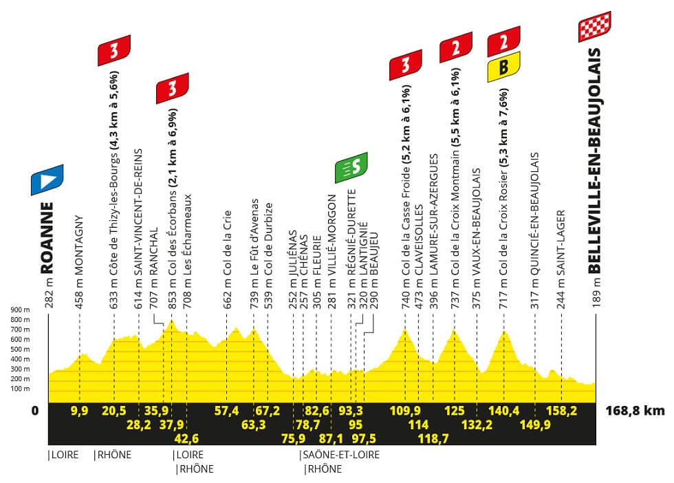 Este jueves la duodécima etapa, tendrá un recorrido de 168.8 kilómetros, una fracción de media montaña con cinco puertos tres de tercera y dos se segunda categoría, entre las localidades de Roanne y Blleville-En-Beaujolais.