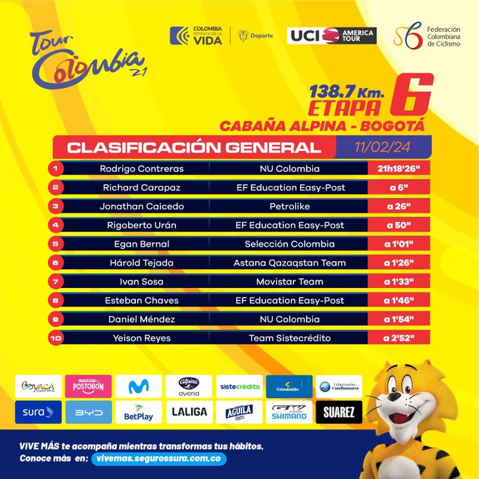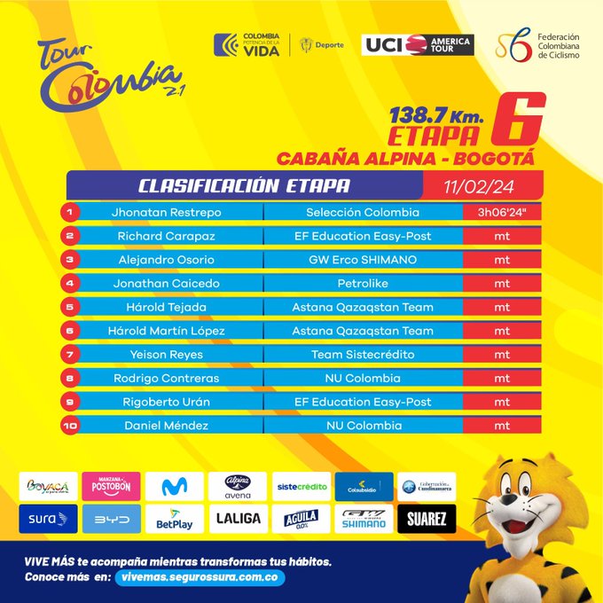 En al jornada final, la victoria fue para Jhonatan Restrepo (Selección Colombia) que se impuso en un electrizante sprint superando al ecuatoriano Richard Carapaz (EF-Education-EasyPost).