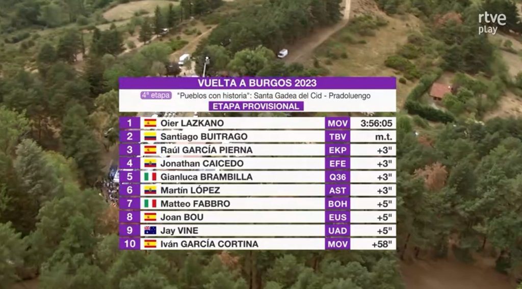 El español Oier Lazkano (Movistar) se adjudicó el triunfo de la cuarta etapa d ela Vuelta a Burgos, superando en la subida al Alto de Acebal-Vizcarra de Pradoluengo al colombiano Santiago Buitrago (Bahrain-Victorious), quien arribó en la segunda posición d el fraccion.
