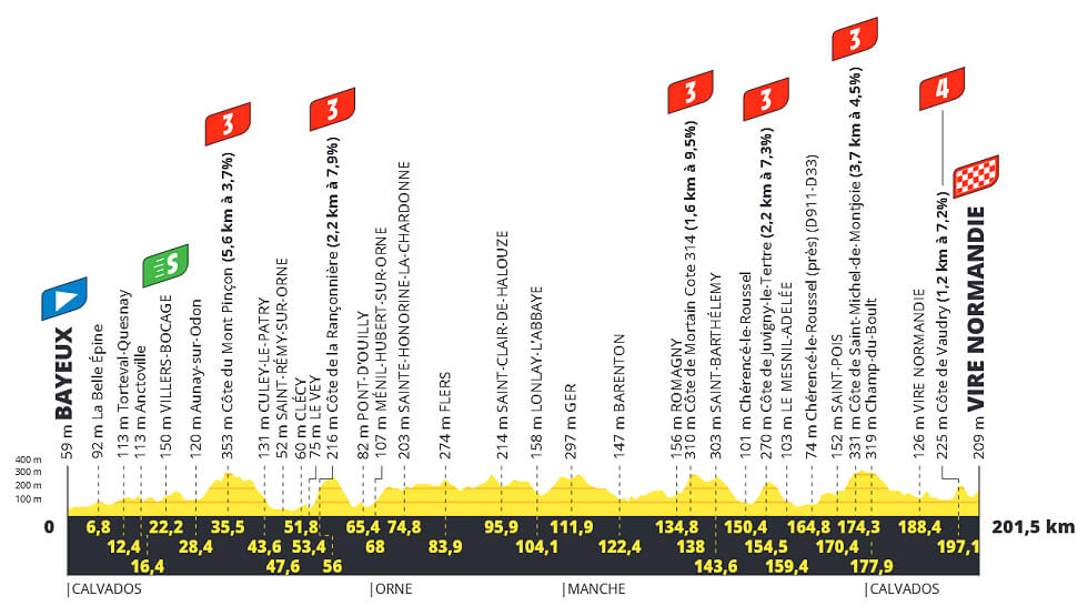 Sobre 201.5 kilómetros, se disputara este jueves la sexta etapa del Tour de Francia entre Bayeux y Vire Normandie, jornada de media montaña con seis puertos puntuables, 5 de tercera categoría y uno de cuarta, propicia para escapadas y movimientos tacticos.