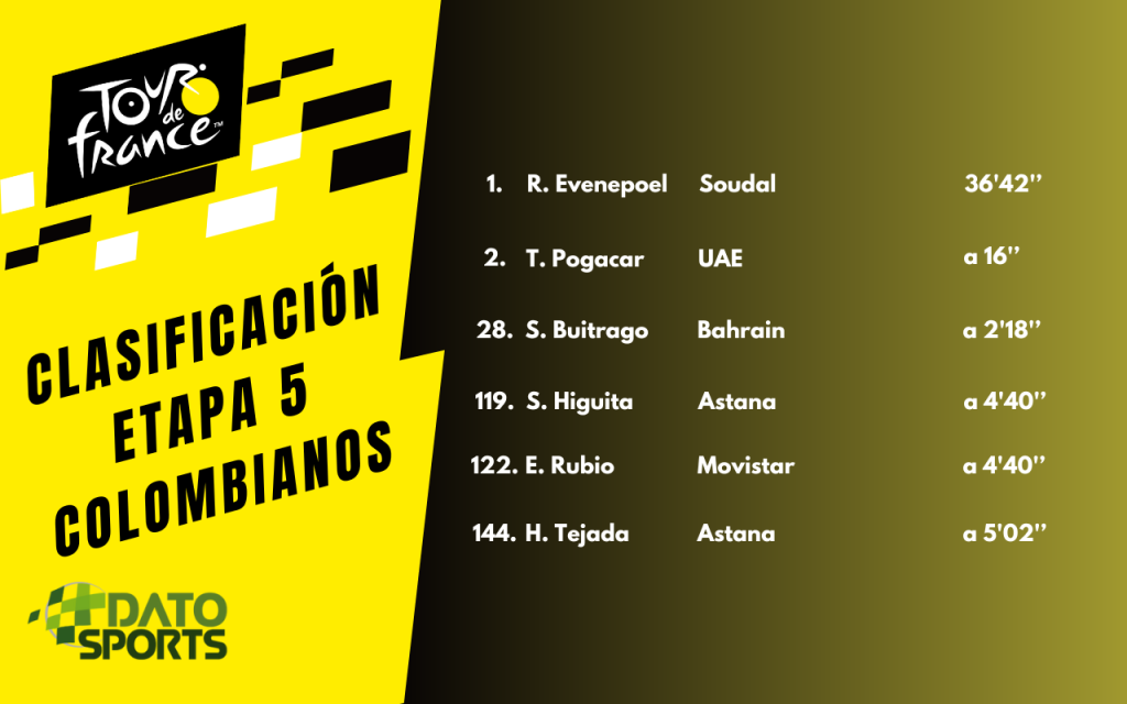 Mientras que el esloveno Tadej Pogacar (UAE Emirates) quien fue segundo en la fracción a 16 segundos del vencedor, se apoderó del maillot amarillo de líder y Santiago Buitrago (Bahrain-Victororious) fue el mejor colombiano en la jornada y ganó tres puestos en la general.