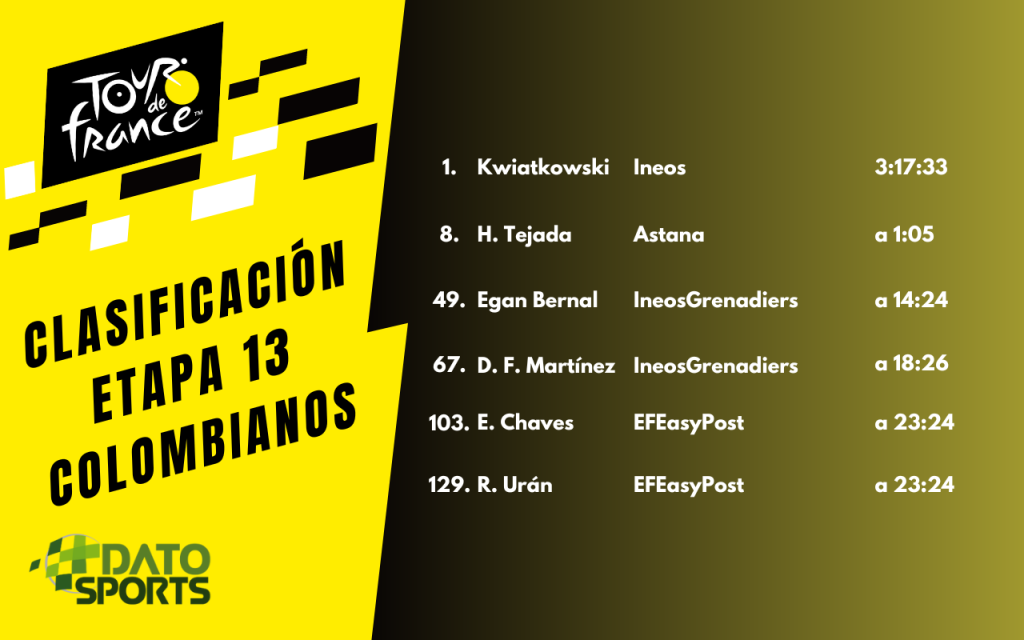 El ciclista polaco Michael Kwiatkowski (Ineos-Granadiers) se impuso en la etapa 13 del Tour de France que finalizo en el Grand Colombier, alto de categoría especial y en donde el danés Jonas Vingegaard (Jumbo-Visma) resistió los ataques de tadej Pogacar (UAE Emirates) y se mantuvo de líder.