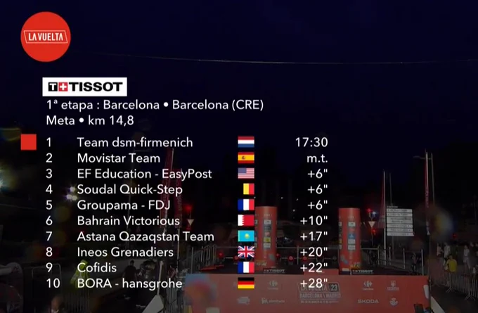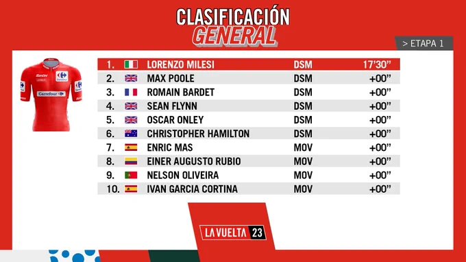 La escuadra holandesa DSM-Firmenich, se impuso en la primera etapa de la Vuelta a España, una crono por equipos de 14.8 kilómetros y se apoderó de la clasificación general, con el italiano Lorenzo Milesi, reciente campeón del mundo sub-23.