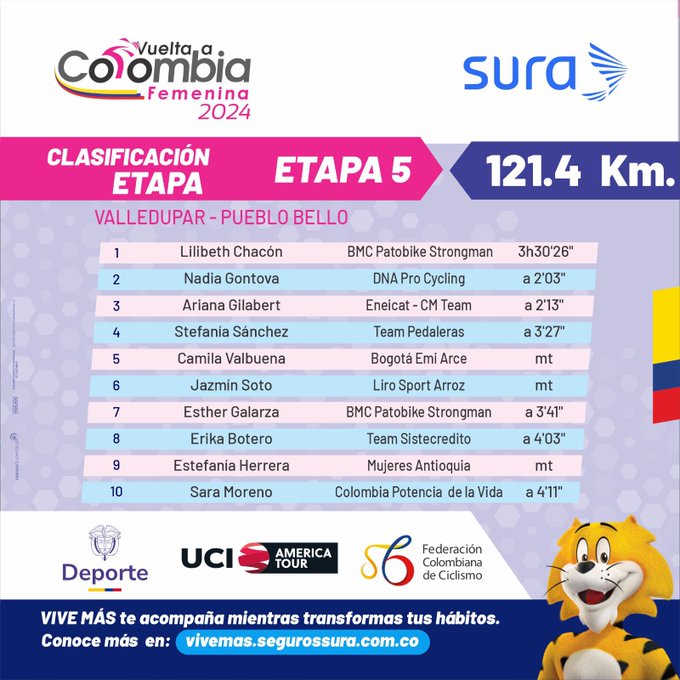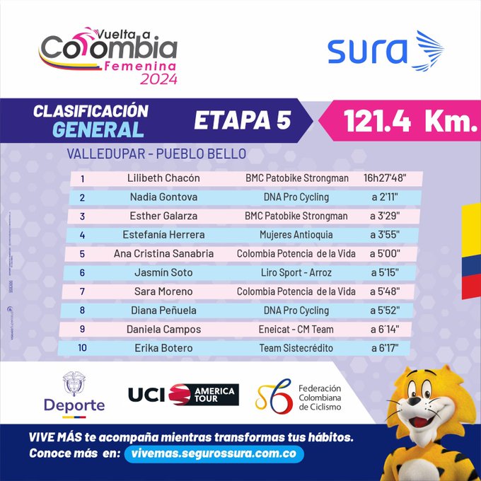 Chacón se enfundo el maillot de líder, gracias a su victoria en la quinta y penúltima etapa, desbancando a su compañera de equipo Esther Galarza, que ahora es tercera en la general.