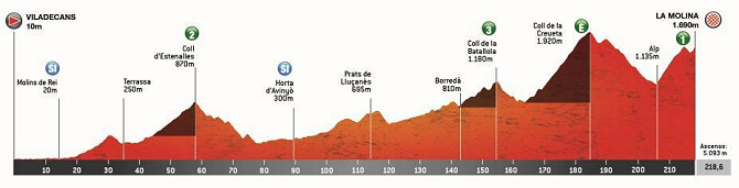 La tercera etapa de la Volta a Catalunya, será la más larga de la ronda catalana desde el año 2006, con 218.6 kilómetros, con cuatro puertos puntuables, que arrancará en Viladecans a nível del mar y terminará en la estación de esqui de La Molina, puerto de primera categoría.