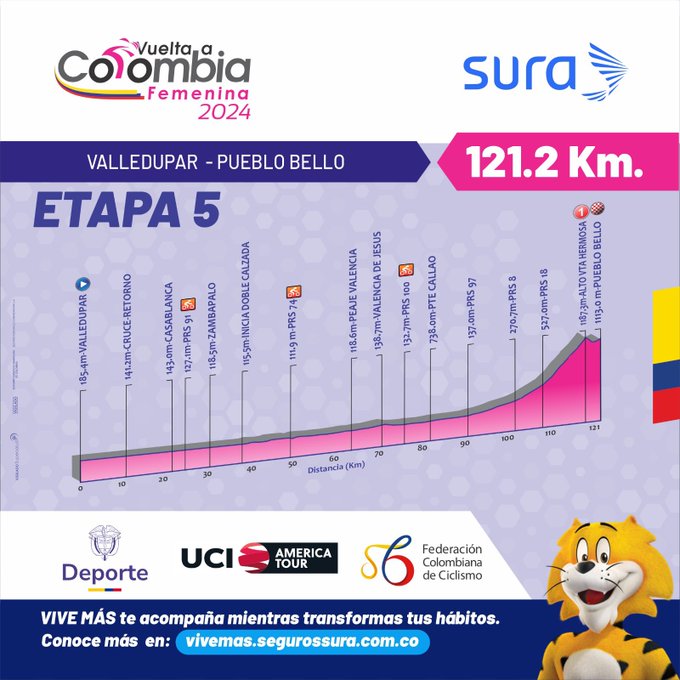 La Vuelta a Colombia Femenina continuará este sábado con la disputa de la quinta fracción la considerada etapa reina, de 121.2 kilómetros entre las localidades de Valledupar y Pueblo Bello, con final en puerto de montaña.