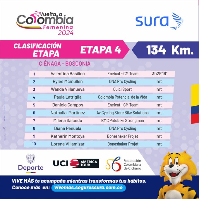 La ciclista italiana Valentina Basilico (Eneicat-CM) de 21 años, se adjudico la victoria en la cuarta etapa de la Vuelta a Colombia Femenina, que se disputó entre Ciénaga y Bosconia en el departamento del Magdalena.