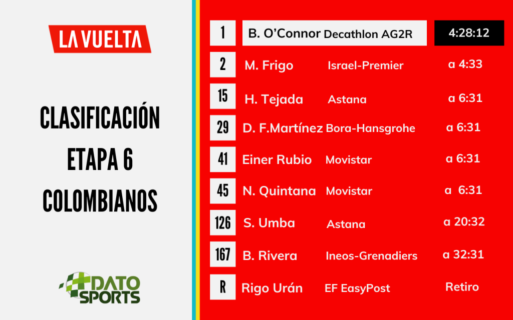 O’Connor de 28 años, hizo parte de la fuga del día, lo que le permitió entrar en el selecto grupo de corredores con triunfos en las tres grades, Tour, Giro y Vuelta y soñar con llegar a Madrid de rojo, al igual que lo hizo hace un año el estadounidense Sepp Kuss, que en una maniobra similar defendió el primer puesto hasta la capital española.