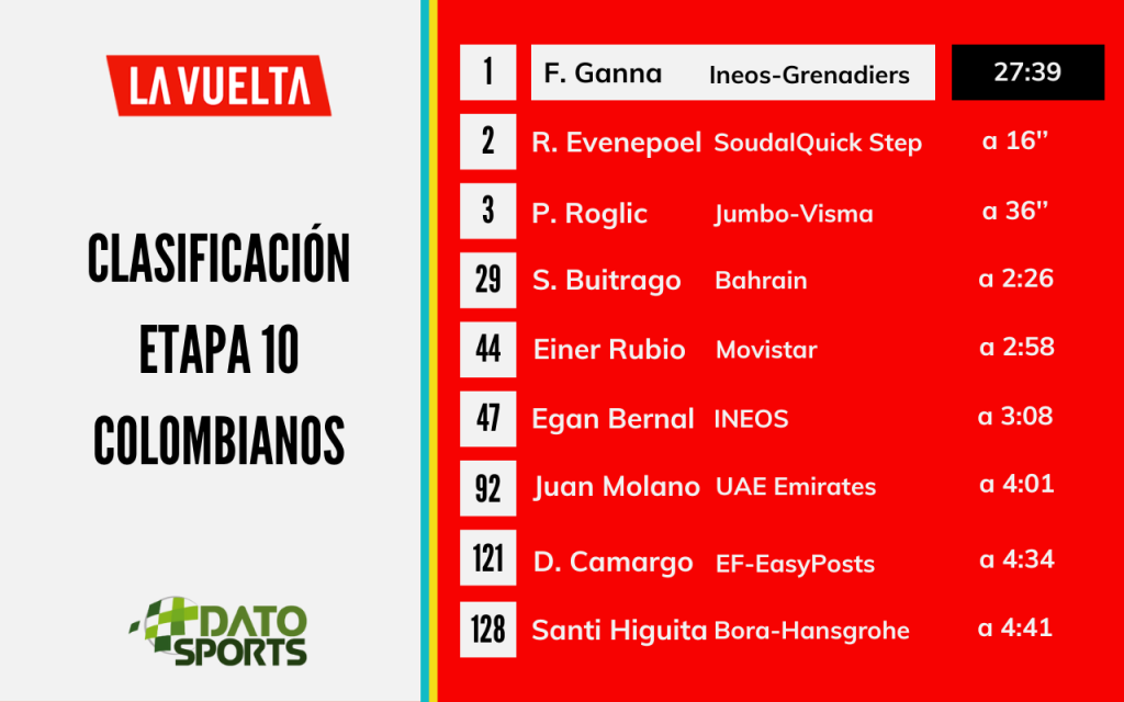 El italiano Filippo Ganna (Ineos Grenadiers) se impuso en la décima etapa de 25.8 kilómetros, una contrarreloj individual en Valladolid y que mantuvo a Sepp Kuss (Jumbo-Visma) como líder de la Vuelta España 2023.