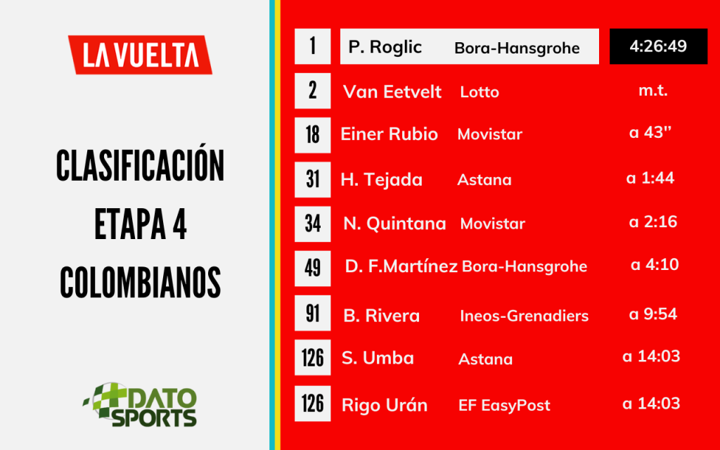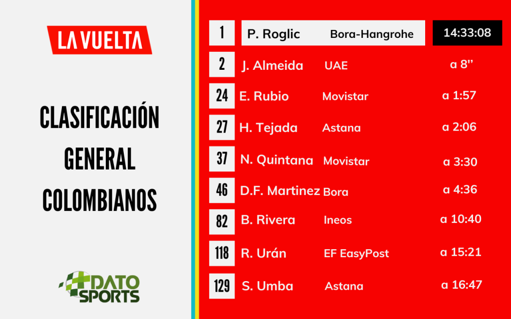 Roglic de 34 años, volvió por sus fueros, dejando claro que esta en forma para obtener el récord de 4 victorias en la ronda española y dejando atrás las caídas en Itzulia y el Tour de Francia. El mejor colombiano en la fracción fue Einer Rubio del Movistar.