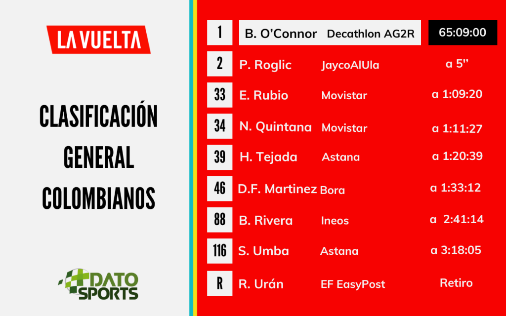 Ben O’Connor lucirá por decimo segundo día la camiseta roja de líder, luego de defenderla ante los ataques de Enric Mas, Primoz Roglic y Richard Carapaz, quienes lo pusieron contra las cuerdas y por solo 5 segundos de mantuvo en lo más alto de la general.